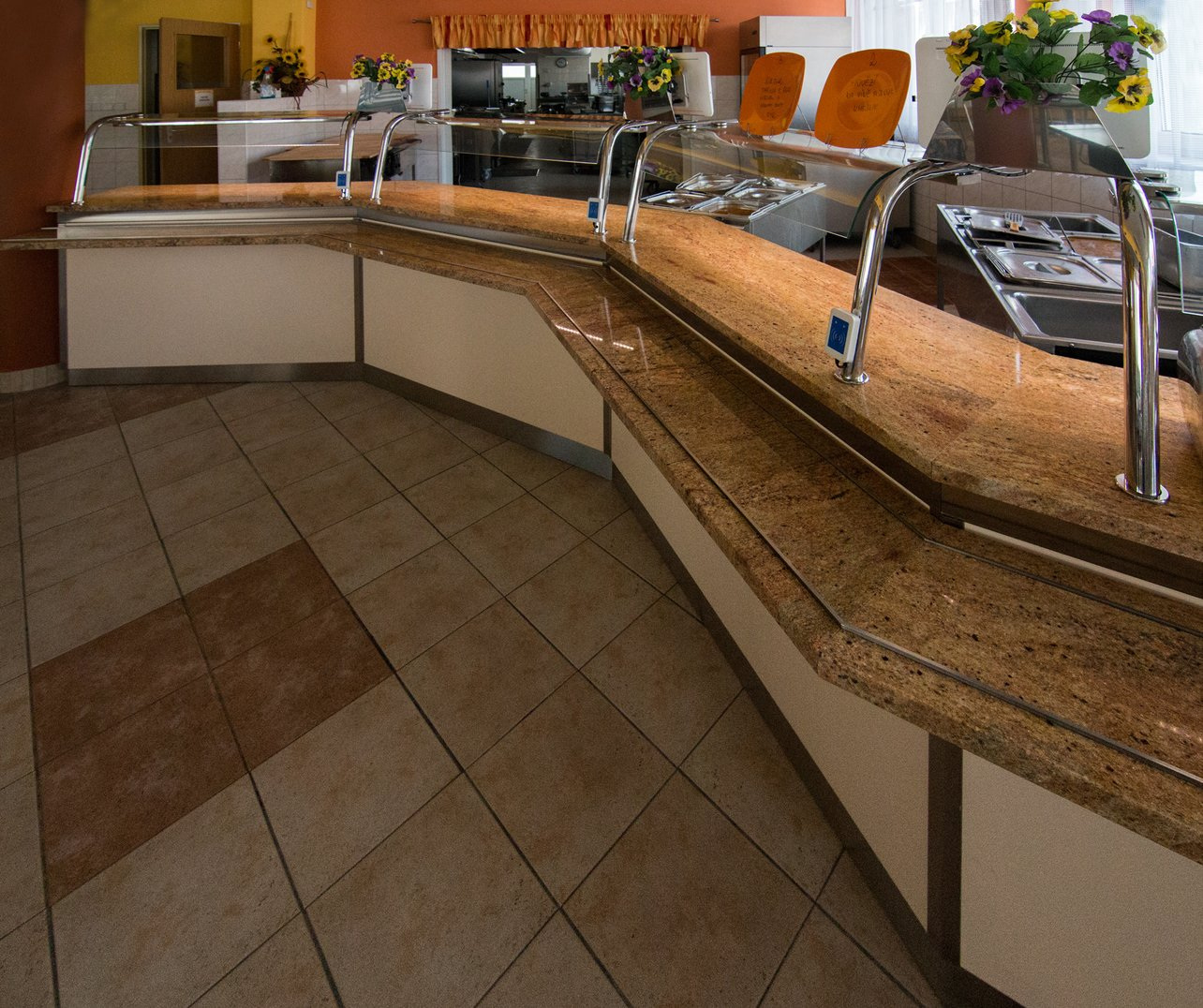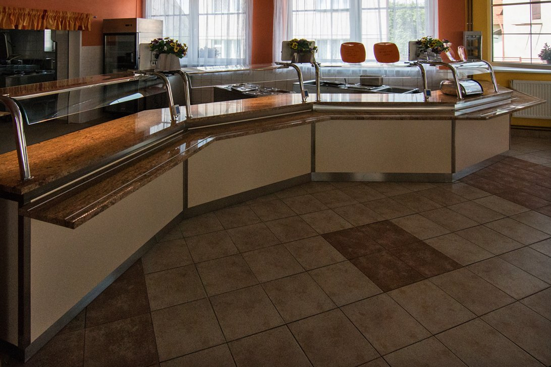Rekonstrunce výdejní linky ve školní jídelně v Chocni, včetně návrhu. Na výrobu byl požit přírodní leštěný kámen v kombinaci s nerezovou ocelí.